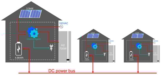 The OES is a fully decentralized microgrid in which autonomous subsystems are interconnected via a DC power bus, using a direct current (dc) procedure for exchange, combined with pure peer-to-peer (P2P) communication infrastructure and exchange algorithm []. The OES community is comprised of 19 houses, equipped with dc nanogrid, batteries, solar panels and loads, which represents a basic standalone subsystem. Each subsystem also has a connection the standard electrical (AC) grid, which is used as an auxiliary power supply. More detailed description of this type of system can be found in the referenced papers [,].