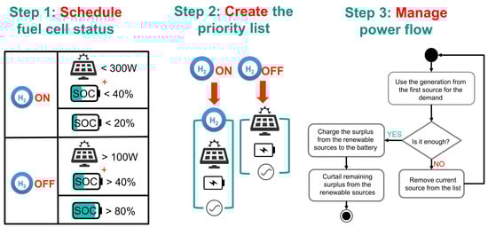 The internal agent is responsible for scheduling the power flows to and from the configured modules. It is designed for standalone house, equipped with batteries, energy sources and loads. The central idea in the design of the system is to offer choice to the prosumer for the number and the type of power sources they wish to install in their home. The configurations allow for the installation of one or more power sources such as wind turbines, fuel cells, solar panels, AC grid, etc. In the system used on the original paper [], the only requirement was for each connected source to be assigned clear priority, based on the estimated energy price and the cost for curtailment. Usually power sources with expensive curtailment, like fuel cells, are given higher priority even though the cost for electricity for solar energy is lower. In the case of this prototype the priority is as follows: fuel cell output, when available; solar generation; battery; utility grid. In this system, the battery plays a dual role as both a power source and a load.