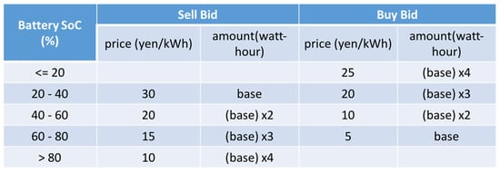 The paper uses the same bidding strategy as previous works []. As it can be seen on Figure 3, it used the State-of-charge (SoC) of the battery to predict future need of electricity, in this case for the next 30 min. The base amount, seen in Figure 3, refers to the minimum amount of electricity available for exchange, calculated as a function of the dc line capacity and the trading timeslot duration to avoid line congestion.