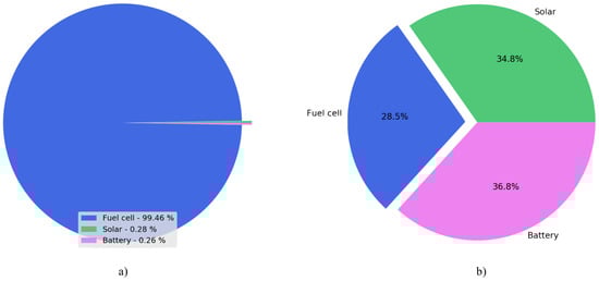 Example of energy usage by power sources for low consumer with priority-based internal agent (a) without fuel cell scheduling function and (b) with added scheduling capabilities.