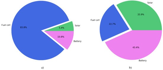 Unlike low customers, the prosumers in the other two categories exhibit similar behavior, as it can be seen in Figure 6a and Figure 7a. For the average consumers, between 80% and 85% of their consumption is covered by the fuel cell generation while for the high consumers that number decreases. The estimated 10% difference is covered by the battery while the solar usage remains relatively the same. Similar to the low consumers, the prosumers in these two categories have energy excess that is likely to be curtailed although not to the same extend. In addition, higher energy cost is observed for all prosumers due to the heavy usage of the fuel cell.