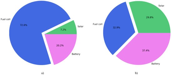 Example of energy usage by power sources for high consumer with priority-based internal agent (a) without fuel cell scheduling function and (b) with added scheduling capabilities.