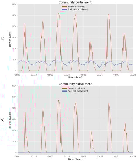 Average curtailment in community, comprised of standalone houses with solar panels and fuel cells, using priority-based internal agent (a) without fuel cell scheduling function and (b) with added scheduling capabilities.