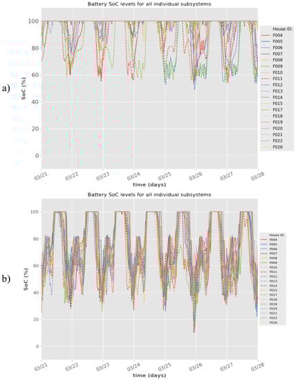 Battery SoC level of all standalone systems in the cases of using (a) priority-based internal without fuel cell scheduling function and (b) priority-based internal with added scheduling capabilities.
