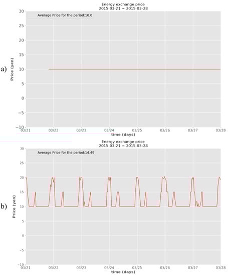 Market price within a community, comprised of standalone houses with solar panels and fuel cells, using priority-based internal agent (a) without fuel cell scheduling function and (b) with added scheduling capabilities.