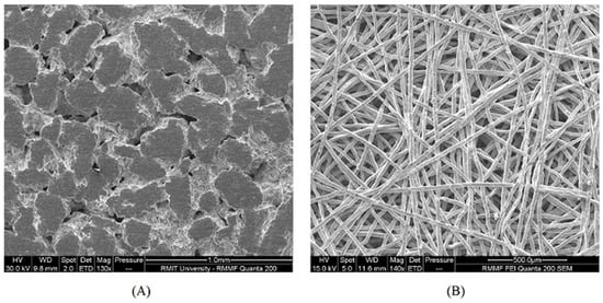 Metal foams, commonly Ni, Pb and Cu, are mostly used as electrodes in batteries []; Ni foam has also been used in fuel cells as flow field [,]. Sintered metal powders/fibres (Figure 1) are commonly used as GDLs in polymer electrolyte membrane (PEM) and solid oxide (SO) electrolysers or URFCs [,] instead of carbon-based GDLs that usually corrode rapidly in such hydrated environments. Sintered metal fibres or powders are of particularly high interest due to their strong mechanical properties that make them suitable for providing mechanical support for other components in applications such as high-pressure water electrolysis [,,]. Sintered metal powders provide porosities lower than 50% [,], which is suitable for electrolyser applications []; on the other hand, sintered metal fibres can provide porosities higher than 50% that is suitable for applications such as PEMFCs or URFCs [,]. In these kinds of applications, the electrical conductivity plays a major role in the performance as higher conductivity translates into lower ohmic losses, and hence higher efficiency.