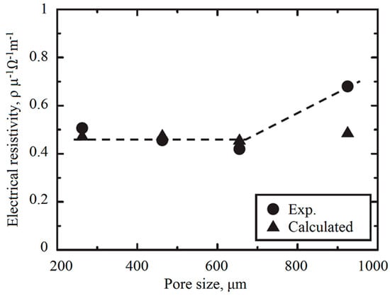 Most of the models used for predicting the electrical conductivity of porous media are a function of porosity. Pore size has been shown to have a negligible effect on electrical conductivity [,,,]. Feng et al. [] have analysed aluminium foams with pore diameters of 1.7, 2.5 and 3.6 mm and have reported a negligible difference between them. Zhou et al. [] have analysed sintered copper fibres and have suggested that pore size has a minor effect on the electrical conductivity. Similarly, Goodall et al. [] have reported no effect of pore size on the electrical conductivity of open cell aluminium foams; they have measured the electrical conductivity of aluminium foams with pore sizes of 75 µm and 400 µm with porosities between 64% and 93%. Hakamada et al. [] have investigated the effect of pore size on electrical conductivity of porous aluminium (Figure 2): for the range that they have considered (i.e., from 212–300 to 850–1000 µm) the effect of pore size on electrical conductivity was found to be negligible, especially with pore sizes smaller than 600 µm.