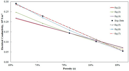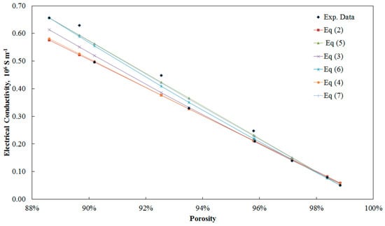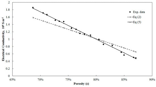 The critical porosity for the three fitted models is around 95% that is consistent with what is expected in reality. Equation (2) and its modified version, Equation (5), are presented against the experimental data from Feng et al. [] in Figure 4. From this figure, it is evident that the experimental data do not approach zero conductivity at 100% porosity. The presumption of having zero conductivity and 100% porosity results in substantial errors and does not reflect an accurate relation between porosity and electrical conductivity.