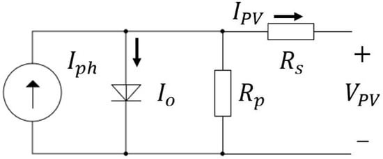 To understand more about the operation of the PV system, the PV’s module can be modeled using the single-diode equivalent circuit [40]. Figure 3 shows the single-diode equivalent circuit including a current source connected in anti-parallel with a diode, including a series resistor and parallel resistor . Equation (1) shows the mathematical relationship between the PV module’s current and other related parameters [41]. Further, Equation (2) presents the expression of the PV module’s open-circuit voltage [42].