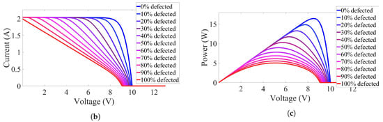 In the modeled circuit, the small resistor represents the defected PV cell. When PV is in operation, this resistance induces the large current which reduces the PV’s output current . This induced current exists inside the module and produces the high level of power dissipation in the PV’s cell. In consequence, the defected PV cell is heated up due to the increase in temperature. Further, if this heat is kept for some time without detection, damage can occur in the form of a hotspot. Although the researchers understand the cause of hotspots, the observation of hotspot occurrence over time is difficult, since the circuit inside the PV cell is not accessible. Direct measurement of the module short-circuit current will not work, since the bypass diode will conduct the current around the defected cell [43]. In this case, another indirect measurement is performed using the I–V and P–V characteristic curve. The proposed approach is similar to the method utilized to determine the cell shunt characteristics by observing the curves under different levels of hotspot-spreading areas. From this data, the worst-case hotspot conditions can be monitored. Information from Reference [44] describes the PV module structure, which consists of many interconnected PV cells connected in series encapsulated into a single stable unit. The model of the PV module is then generated. Figure 5a shows the graphical picture for the PV module with different levels of hotspots from 0% to 100% with an increment of 10% by dividing the PV’s cell into ten groups, and Figure 5b,c displays the I–V and P–V curves from the hotspot levels.