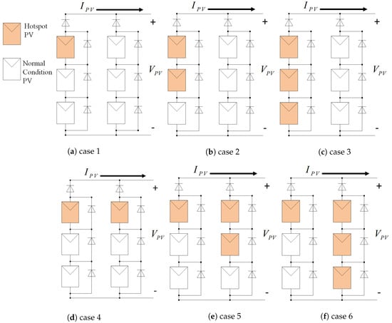 Diagram for the hotspot PV array: (a) case 1; (b) case 2; (c) case 3; (d) case 4; (e) case 5; (f) case 6.