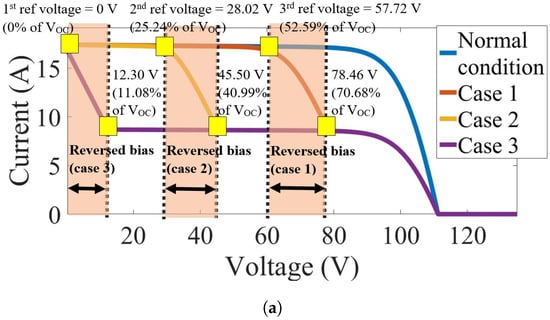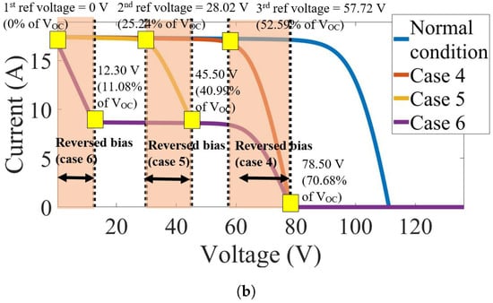 Figure 7a,b displays the I–V curves for all mentioned cases (series-connected hotspot PV array is shown in Figure 7a and parallel-connected hotspot PV array is shown in Figure 7b).