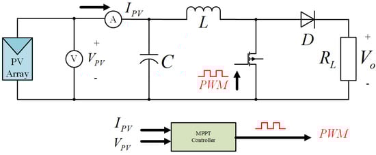 In general, the DC–DC converter for the PV system is used in conjunction with the MPPT controller to control the input voltage and current from the PV to reach its maximum power point. Figure 8 shows the basic PV system block diagram built into the boost converter [44].