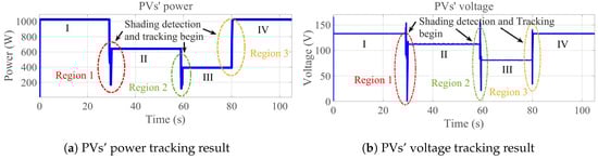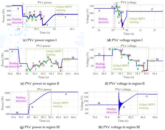 Figure 13a,b shows the complete results of the proposed method, including the tracked power and located voltage. The tracking is divided into three regions, whereas Figure 13c,h magnifies the graphical results in each region for better understanding. Figure 13c shows the magnified global MPPT tracking process in the transition from case I to II. It is observed that the PVs’ power drops from 1023.5 W (point A) to 554.4 W (point B); then the global MPPT starts tracking from point B onwards. Starting from the first slope calculation point of the P–V curve (point C), the tracked slope shows the negative result (represented by the green arrow); the system records the peak value at point D. After that, the algorithm continues the same calculation in other regions by shifting to the next searching region, as the voltage’s transition shows in Figure 13d. All tracked powers are marked at points D, F, and H. For the next region, since the slope of the voltage shows the positive result (represented by the red arrow), the points I and J are then rejected from the power tracking. Finally, the system compares and returns the maximum value, which is point F, as illustrated in Figure 13c. The tracking response time from case I to II takes approximately 0.77 s (0.90 s if the detection time is included).
