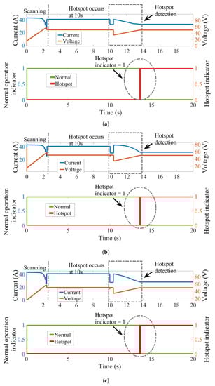 Numerical result for the proposed hotspot detection algorithm using different PV specifications: (a) 85 W; (b) 250 W; and (c) 335 W.