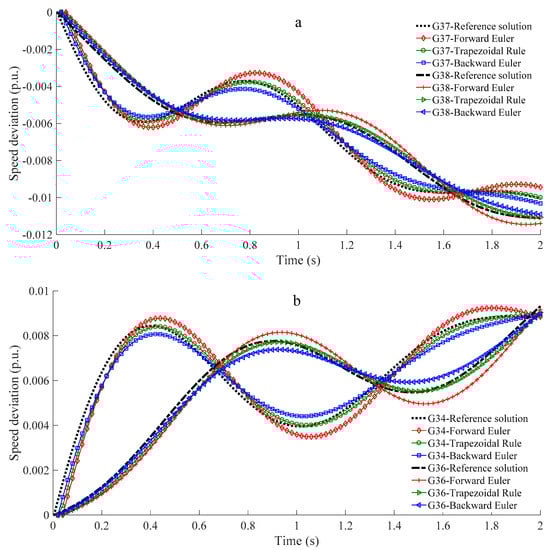 In this scenario, the rotor speed of synchronous machines increases as they transform the demand of the disconnected load into kinetic energy. Again, the result of the curves obtained by the different integration methods follows the same tendency. Finally, Figure 8c shows the rotor speed deviation of power plants connected to buses 30 and 31 when the line connecting buses 2 and 3 is lost. Similar conclusions can be obtained here with respect to the different integration methods.