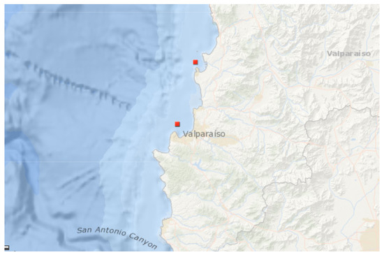 The series of and T correspond to measurements in meters and T in seconds, with a resolution of 3 h, which were generated by two buoys located on the coast of Valparaiso (see Figure 1, red marks) belonging to the Servicio Hidrográfico y Oceanográfico de la Armada de Chile (SHOA). The dataset was used with the objective of illustrating the application of the methodology. There are no better samples of data for the Chilean coast. Table 1 summarizes the specifications of this information: