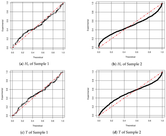 Once the parameters were estimated, the model Was validated. The method used for the present work corresponded to the analysis of uniform residuals [30]. This technique determined whether the data being adjusted could actually be described by the proposed process. The result of this analysis was graphically observed by means of a quantile-quantile plot, which compared the experimental distribution of the data with the theoretical distribution of the stochastic process. If the identity line were obtained, then it could be concluded that the model satisfactorily adjusts the observed data. Figure 2a–d shows the quantile-quantile plot of this analysis for each sample data and each model.