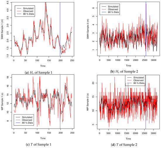 The quantile-quantile plots in Figure 2a,c correspond to the settings for Sample 1, which consisted of 248 observations. It was observed that the points in the graphics followed approximately the identity line, thus it was affirmed that there is no reason to doubt these adjustments. For the plot in Figure 2b,d, corresponding to Sample 2, which consisted of a total of 3207 observations, the line was not precisely the identity line. The deviation of the curve suggests that the proposed process failed to describe certain characteristics of the data, removing the precision of the model. The difference between the results of Samples 1 and 2 might be due to the fact that they were very different in size: Sample 2 consisted of many data. Tthe nonlinear and non-stationary behaviors of the oceans might be very strong and do not allow the correct fit of the proposed hybrid model. This was not observed in Sample 1, which corresponded to a much shorter observation interval in which it is possible that nonlinear and non-stationary effects were not fully captured.