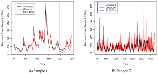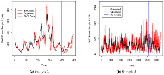 The series for the power generated under Equation (10) for both samples of data are presented graphically in Figure 4a,b, respectively.