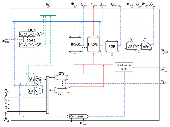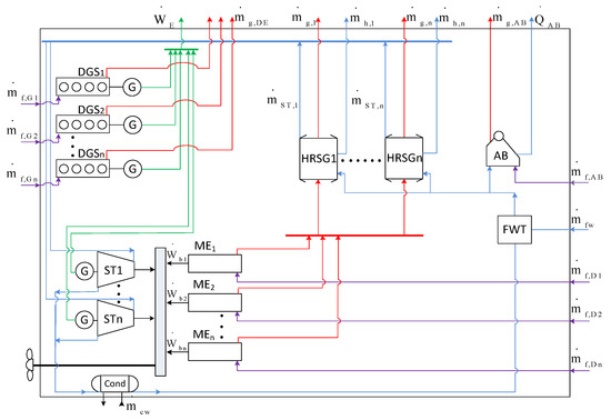 The system is used for covering the demands for propulsion (), electrical () and thermal power (), during different operating modes of a ship. The number of the operating modes is considered predetermined and equal to NT. The superconfiguration of the system considered is presented in Figure 2.