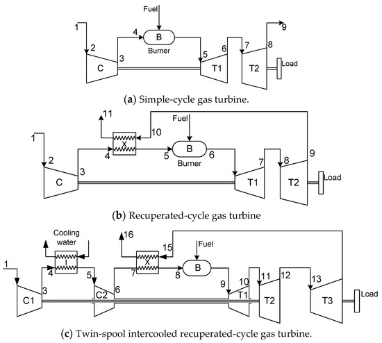 Doulgeris et al. [51], gas turbine-based systems are assessed as an alternative for installation on a RoPax fast ferry ship. Simple cycle and intercooled–recuperated configurations are studied. In the method presented, several technical, economic, and environmental parameters concerning the operation of the system during the whole life cycle of the ship are taken into account. The study reports the benefits of using intercooled–recuperated gas turbines in comparison with simple cycle configurations. De Leon et al. [52], the development of a computer simulation framework is described which is used for assessing the differences of the thermodynamic efficiency and other performance characteristics of intercooled−recuperated, intercooled−reheated, and intercooled–reheated–recuperated configurations.