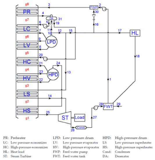 The HRSGs are of double-pressure and the nominal values of PHP, PLP, , , , and for HRSG z are to be used as inputs for simulating the integrated energy system. With values for these variables set, the design procedure described in Section 2.3.2 can be initiated for each HRSG. The design procedure is used for the determination of the heat exchange areas throughout the HRSG and with these areas determined, the off-design operation properties of steam (that is, mass flow rates and and temperatures and ) can also be calculated.
