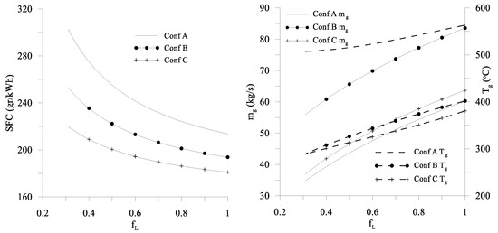 The fuel consumption and exhaust gas properties (mass flow rate and temperature ) of each of the main engines can afterwards be calculated (as the nominal power rating and partial load brake powers are already determined) for each mode by applying the computational simulation procedures of gas turbines described in Section 2.3.