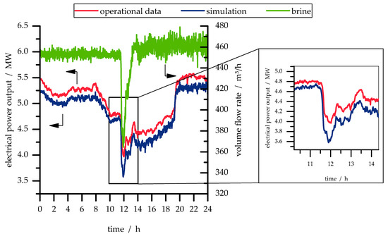 To validate the double-stage ORC, a period of 24 hours is simulated in steps of one minute. For the investigation of CHP-concepts the electrical power output is important and, therefore, this parameter is validated. The simulation results are compared to real operational data with a step in the brine volume flow rate. The step in the flow rate could represent a sudden change in the heat demand (Figure 4). The results are shown in Figure 4.