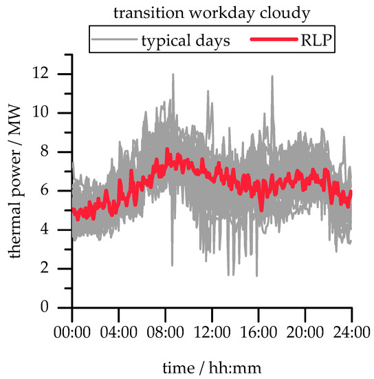 The RLP for all typical day categories are developed by the method shown in Section 2.2. Exemplarily, the results are shown for the typical day ÜWB. Figure 5 shows all heat demand profiles of this category (grey color) and the identified RLP (red color).