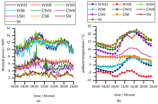 In the considered year, 45 days could be allocated to the category ÜWB. The figure shows that, based on the presented method, qualitatively and quantitatively characteristic heat demand profiles can be developed for each typical day category. All developed RLP and the corresponding ambient temperatures are shown in Figure 6.