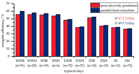 Exergetic efficiency of each typical day for pure electricity production and parallel heat extraction.