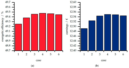 At first, the amount of the mass flow rate coupled to the DHN at point B in Figure 3 is varied in steps of 5% to optimize the system performance in terms of efficiency. Overall, 6 cases are considered, where in case 1, 5% of the mass flow rate are fed to the DHN and in case 6, 30%, respectively. The results are shown in Figure 8.