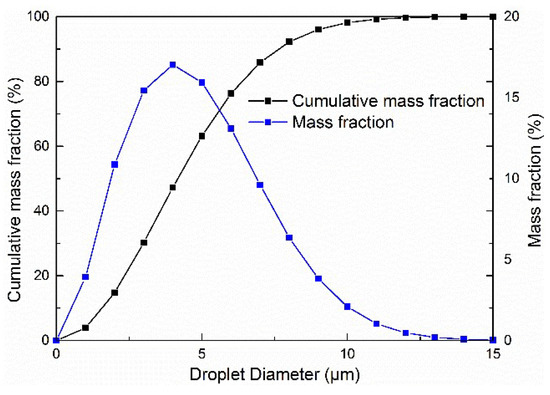 Referring to the settings of Sun et al. [37], we set n = 2. Figure 2 is the distribution of the droplet diameter when n = 2 and de = 5 μm. The water injection ratio is defined as the ratio of the water mass flow and the air design mass flow at the compressor inlet.