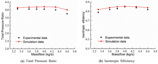 The numerical validations of the turbulence model and two-phase flow model are carried out in the paper. A Krain centrifugal impeller was selected to validate the turbulence model. Both this impeller and the research object are subsonic backswept centrifugal impellers. Its designed mass flow rate and pressure ratio are 4 kg/s and 4.7, respectively [39]. The comparisons of the simulation and experiment data are shown in Figure 3. It can be found that the total pressure ratio and isentropic efficiency are in good agreement, demonstrating that the selected turbulence model is suitable for the research object in this paper.