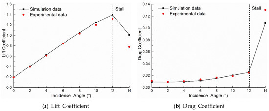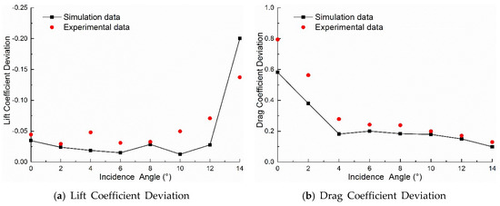 The NACA 64-210 airfoil is chosen to validate the two-phase flow model. The geometry and experimental data are from the literature [40], and the rainfall parameters are from the literature [41]. The comparisons of the simulation and experiment data with rainfall are shown in Figure 4. The average deviations of the lift and drag coefficients between the simulated and experimental data are approximately 6% and 8%, respectively. The relative deviations between rain and no rain are shown in Figure 5 and the simulated and experimental data have the same trend. It is proved that the chosen two-phase flow model is suitable for this research.