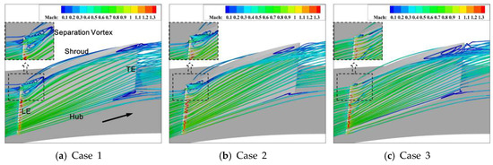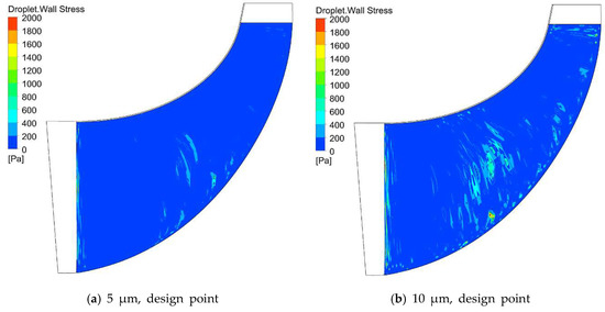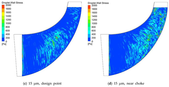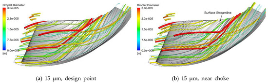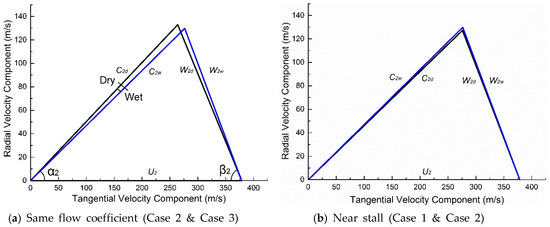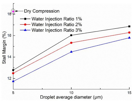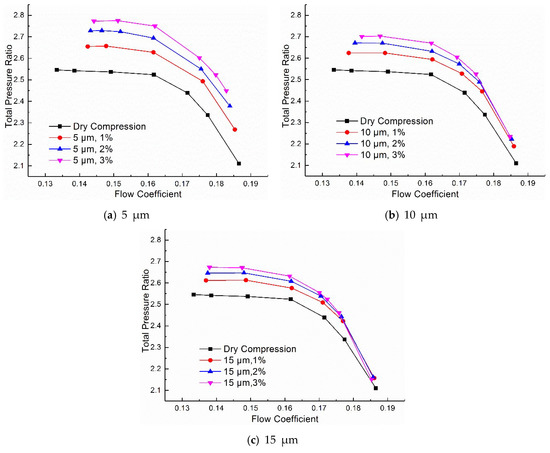 The dry and wet compression performance curves of the total pressure ratio and flow coefficient are shown in Figure 6. The performance curves shift to the higher pressure ratio with the increase in the water injection ratio and the decrease in the average droplet diameter. Meanwhile, the performance curves become narrower due to the increase of the near stall flow rate, which is similar to Abdelwahab’s [20] and Beede’s [42] results.