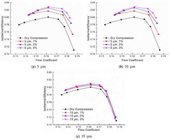 The dry and wet compression performance curves of isothermal efficiency and flow coefficient are shown in Figure 7. With the increase of water injection ratio and the decrease of average droplet diameter, the performance curves shift to the higher efficiency and become steeper. Compared with dry compression, the peak isothermal efficiencies respectively increase by 2.78%, 1.58%, and 0.96% when the water injection ratio is 3% and the average droplet diameter is 5 μm, 10 μm, and 15 μm, respectively. The wet compression isothermal efficiency ηw is calculated as: