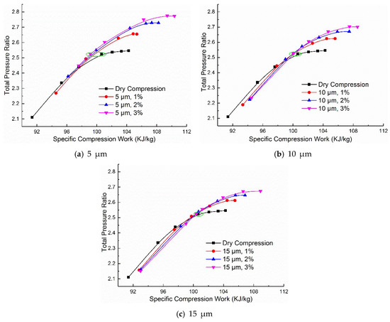 The comparisons of the performance curves between dry compression, different average droplet diameters (5, 10 and 15 μm) and different water injection ratios (1, 2, and 3%) were discussed in this section.
