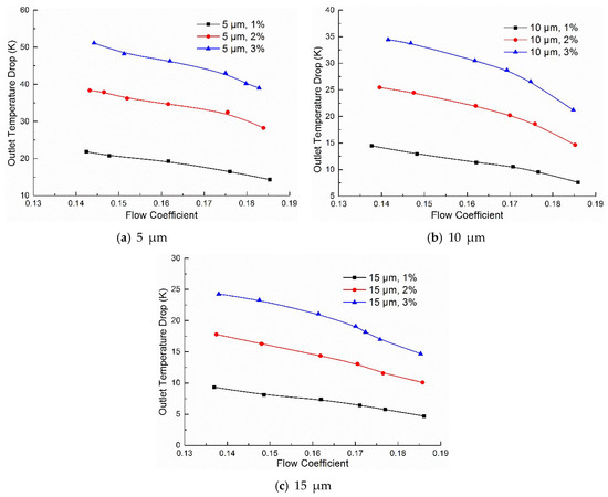 The temperature drop of wet compression depends on the interphase heat transfer. It can be seen from Equation (23) that the heat transfer is proportional to f and 1/d. Figure 9 shows the outlet temperature drop of wet compression (compared to dry compression). The amplitude of the outlet temperature drop strengthens as the water injection ratio increases and the droplet average diameter declines. However, the amplitude falls as the flow coefficient increases, thus indicating that the cooling effect is weakened.