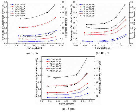 The brake power (or BP for short) is calculated based on the brake torque. The percentages of acceleration and brake power in total power are shown in Figure 10. The acceleration power enhances with the growth of the water injection ratio, but it basically does not vary with the average droplet diameter. According to Equations (24) and (25), the acceleration power is proportional to f, 1/d, and u-up. Although it reduces 1/d, the increase in the average droplet diameter augments u-up [5], so its effect is almost offset. As the flow coefficient increases, the airflow velocity also improves, thus resulting in a larger slip velocity. Near the choke boundary, the acceleration power has a rapid growth.
