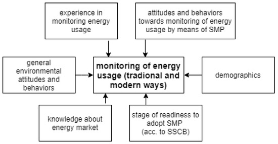 We believe that the installation of a smart meter at home potentially involves two main behaviors of electricity consumers. First, they can interact with an SM device itself. This is, however, rather unlikely, as the device is not user-friendly and quite complex to handle. Second, consumers can use SM platform that allows them to follow their energy consumption patterns. We believe that monitoring of energy consumption patterns is the first step to raise awareness and interest among consumers towards more sophisticated DSM/DR tools, like dynamic electricity tariffs, in-home displays, smart-plugs, smart appliances or even home area networks (HAN). Therefore, within the study, we aim to identify what are the main determinants of monitoring energy usage and, in particular, using the SM platform by energy consumers. Based on the literature review, we have identified a set of individual variables that may account for adoption and non-adoption of SM solutions (see, e.g., [13,22,53,54,68,69,70]. As presented in Figure 1 to these variables belong: