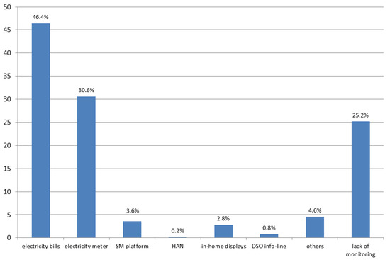 First, based on the questions regarding monitoring behaviors, it was found that almost one quarter of the respondents do not monitor their energy consumption at all (see Figure 2). Out of those who reported to monitor energy consumption, 46.4% monitors their consumption by the means of the electricity bills. One third, (30.6%) uses information from traditional and smart electricity meters. Very few of the respondents have already used SM platform (3.6%), home area network (HAN) (0.2%) or in-home displays (2.8%). The monitoring activities mentioned by the respondents in the category “others” included: turning off the lights, avoiding keeping home appliances in stand-by mode, using a washing-machine and a washer when they are fully loaded, or investments in energy efficient home appliances. As one may notice these reported activities aim rather at energy reduction than at monitoring by itself.