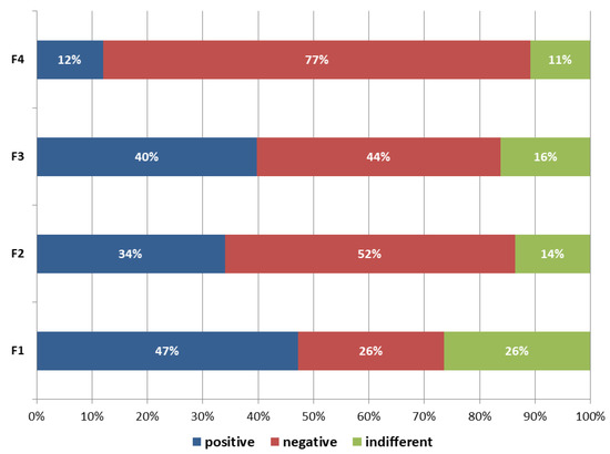 In Figure 3 the negative answers (“no” and “rather no”) as well as positive answers (“yes” and “rather yes”) were aggregated. In stage F1 47% of respondents declined and 26% of respondents confirmed that they do not know and that they are not interested whether they have SM installed or how to use SMP, and another 26% of respondents were indifferent. Also stage F3 had relatively large share of affirmative answers (40%). It included those of the respondents who declared willingness to monitor energy usage and were ready to check whether they have had smart meter already installed at their household together with the free access to the SMP. At the same time 44% of respondents were negative about this statement and 16% were indifferent. Those proportions look even worse for the stages F2 and F4. In case of F2, most of the respondents (52%) did not want to monitor energy usage. In stage F4 only 12% of respondents admitted to regular monitoring of energy usage by means of SMP and wanted to continue such a behavior in the future.