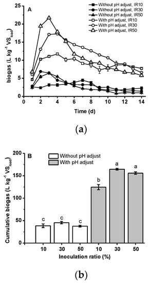 The group of IR50 with pH adjustment had the largest biogas peak value, 21.7 ± 0.2 L/kg VSload/day. After the peak of the biogas yield on day 3, the daily biogas yield decreased gradually to 5.81 ± 0.2 L/kg VSload/day on day 14 (Figure 5a). While the peak value of the daily biogas yield was 17.3 ± 0.3 and 11.7 ± 0.3 L/kg VSload/day for group IR30 and IR10 with pH adjustment, respectively. The peak value of the daily biogas yield was 6.4 ± 0.3, 6.9 ± 0.2, and 4.5 ± 0.4 L/kg VSload/day for group IR50, IR30, and IR10 without pH adjustment, respectively.