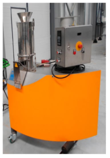 The densification process of the dried BSG was performed in a Kahl AK07 pelleting press with a power of 3 kW and a capacity of 10–50 kg/h, as shown in Figure 2.