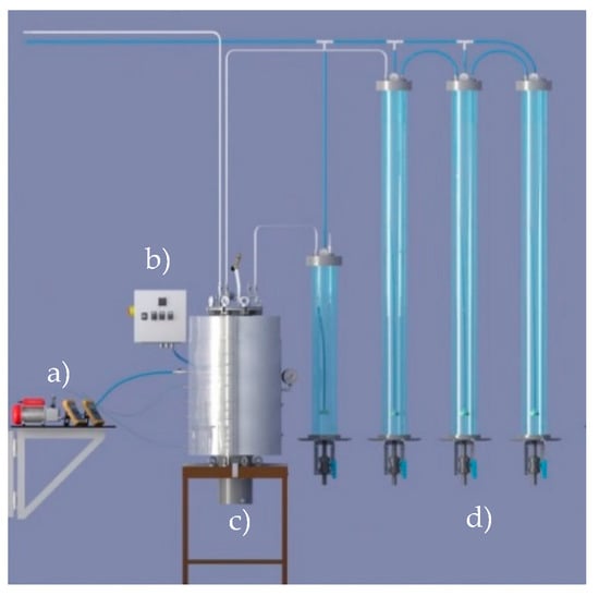 Gasification experimental apparatus: (a) vacuum pump, (b) control panel, (c) reactor, (d) and wet scrubber.