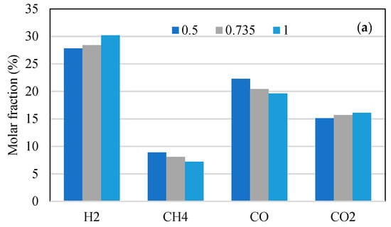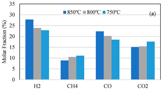 The reactor temperature is one of the most important operating variables for gasification, because the main gasification reactions are endothermic. The final gas composition of the gasification process is the result of combining a series of complex and competing chemical reactions. Figure 6 depicts the syngas molar fraction as a function of the gasification temperature.