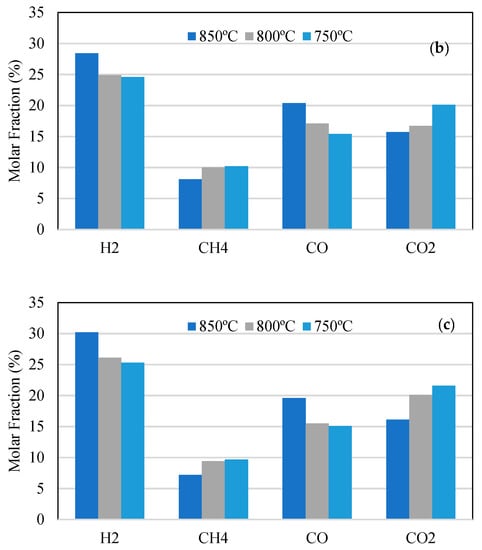 Effect of the steam-to-biomass ratio on the produced gas for temperatures of (a) 850 °C, (b) 800 °C, and (c) 750 °C.