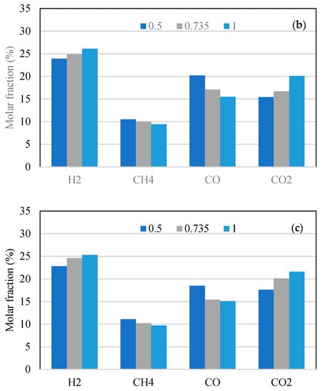 Slight variation of the efficiencies can be seen from Figure 10 in the range of process parameters studied. However, higher temperature slightly increases cold gas efficiency essentially due to the increased CO and H2 content in the produced gas []. The carbon conversion efficiency slightly decreases with the temperature, essentially due to the reduction of the CH4 content, which is not compensated by the increased CO content of the produced gas.